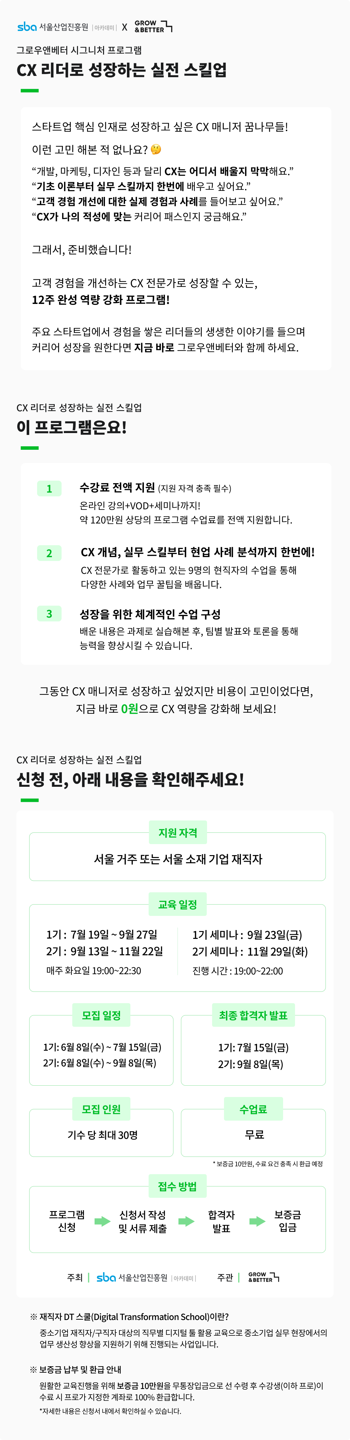 원활한 교육진행을 위해 예치금 10만원을 무통장입금으로 선 수령 후 수강생(이하 프로)이 수료 시 프로가 지정한 계좌로 100% 환급합니다. *1주차 강의 진행 후 중도 취소 신청할 경우 보증금은 환불되지 않습니다. 더 자세한 내용은 신청서 확인 부탁드립니다.