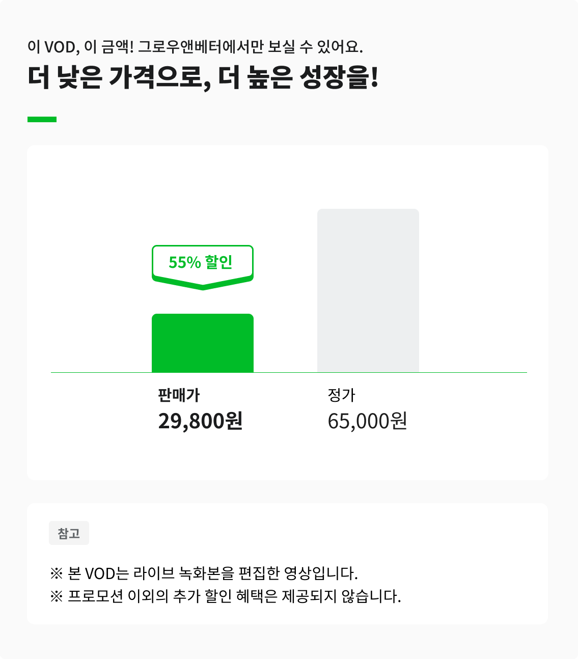 별도의 교안이나 자료가 있는 VOD 서비스라면 VOD 시청 화면 하단에서 “자료 다운로드 하기” 버튼을 통해 다운로드 받으실 수 있도록 제공해드리고 있습니다. 다만, 교안이나 자료가 포함되지 않은 VOD 서비스의 경우, 다운로드 버튼이 보이지 않을 수 있으니 참고해주세요.